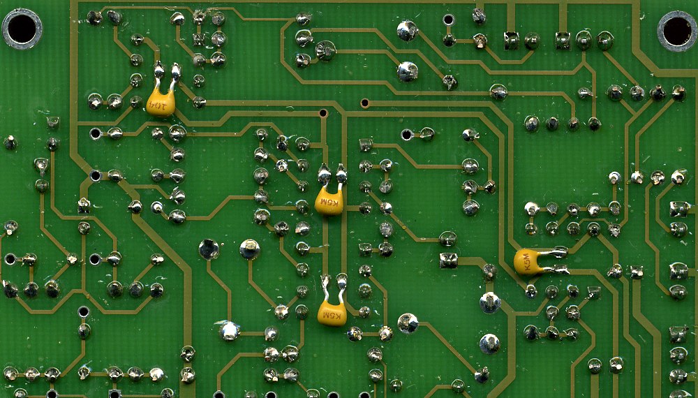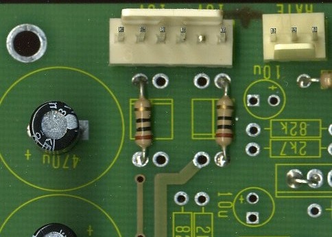 cap (C54 : 470nF). A switch was added to the front panel to connect or disconnect a 4.7µF/16V non-polarized chemical cap. The 4.7µf cap has one leg directly soldered to one lug of the switch, the other leg is soldered to one end of a wire which has its other end directly soldered to one pad of C54 on the PCB. The second lug of the switch is connected to a wire which has its other end soldered to the second pad of C54 on the PCB. |