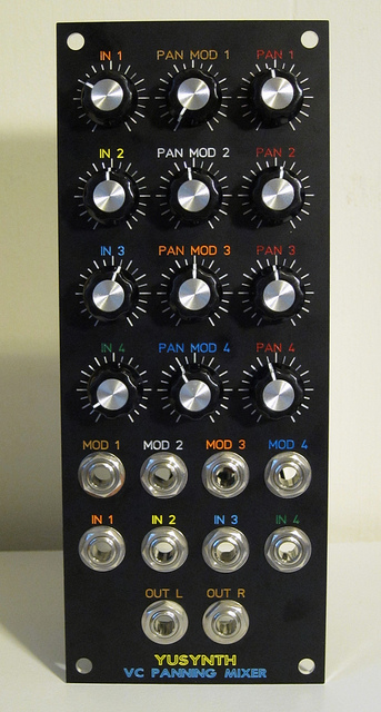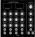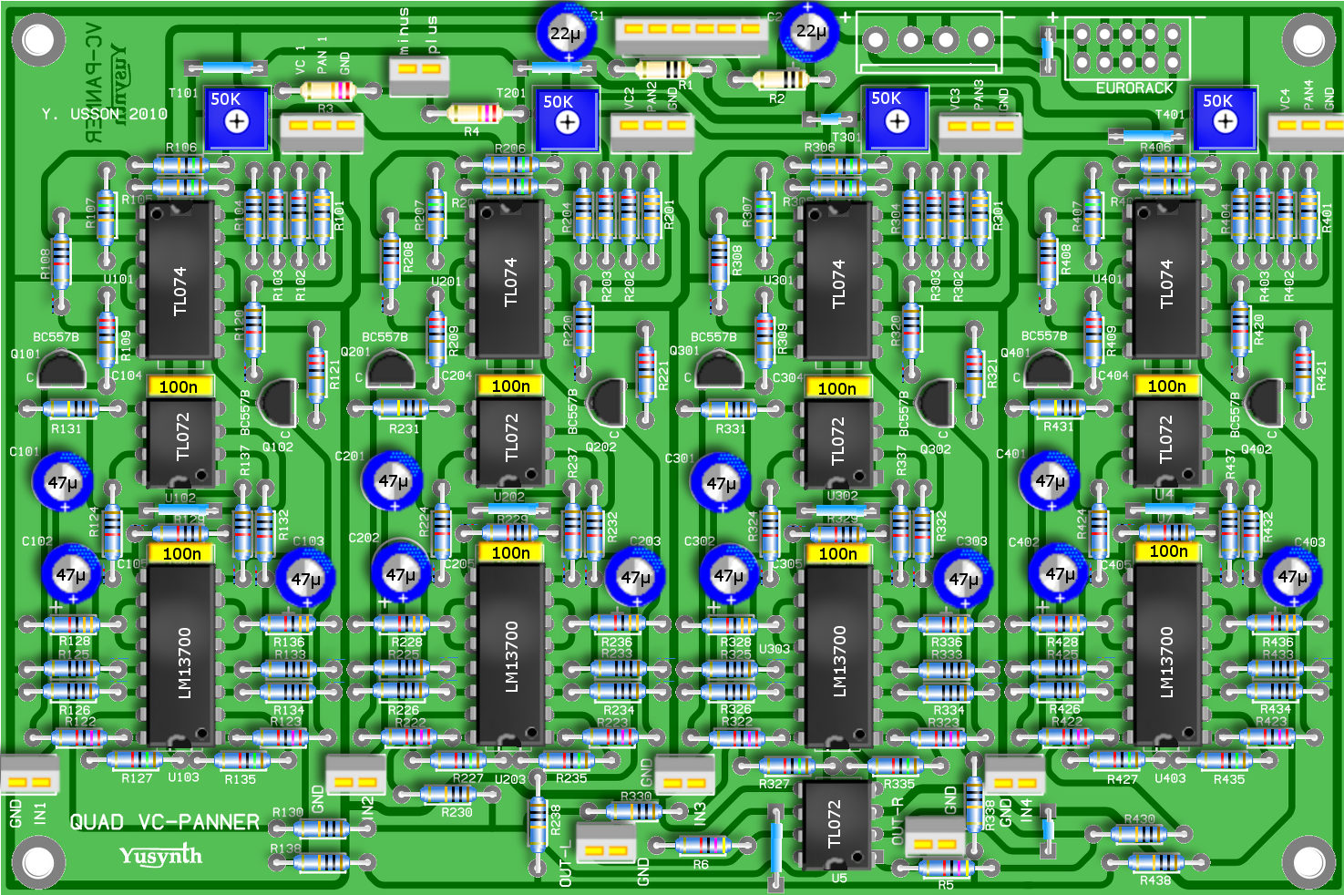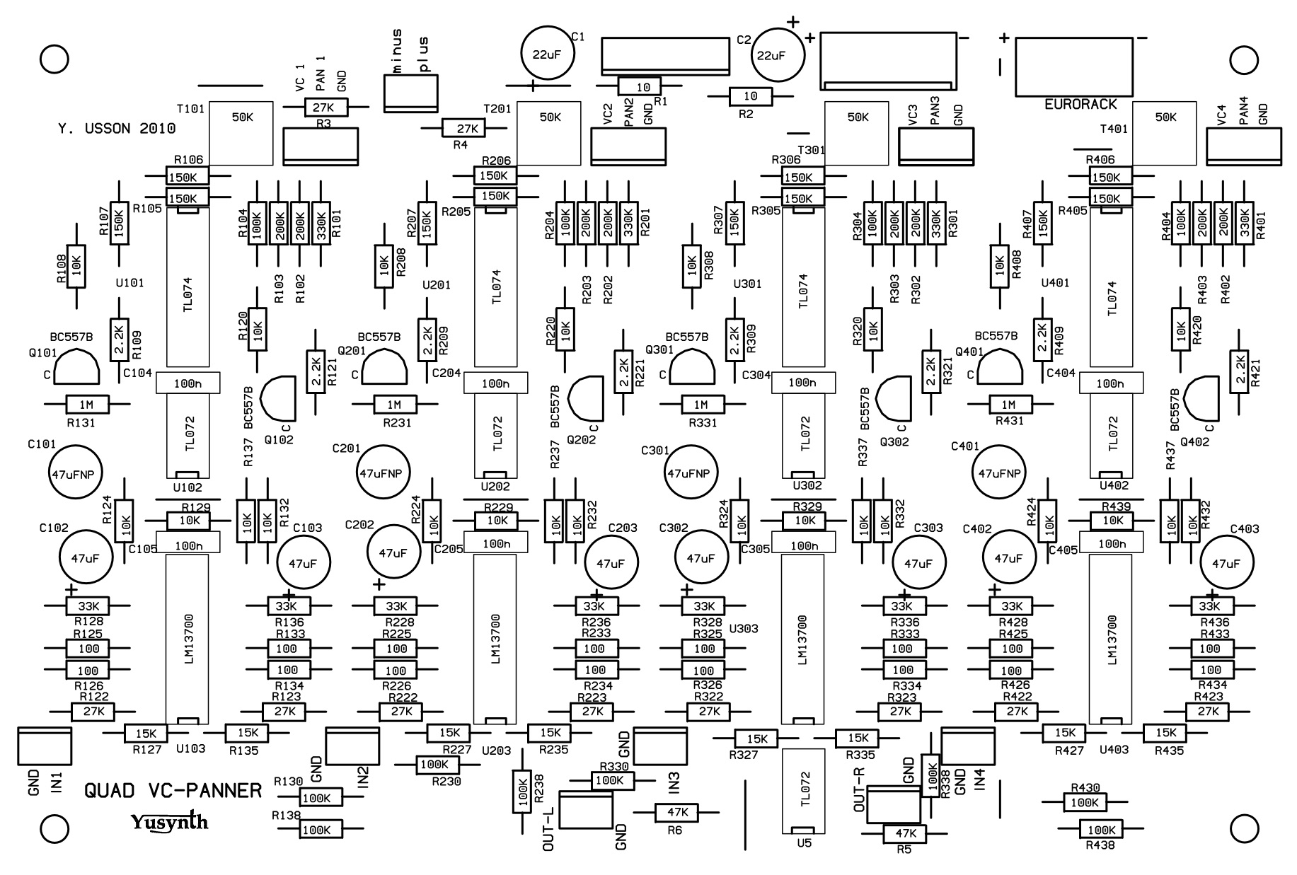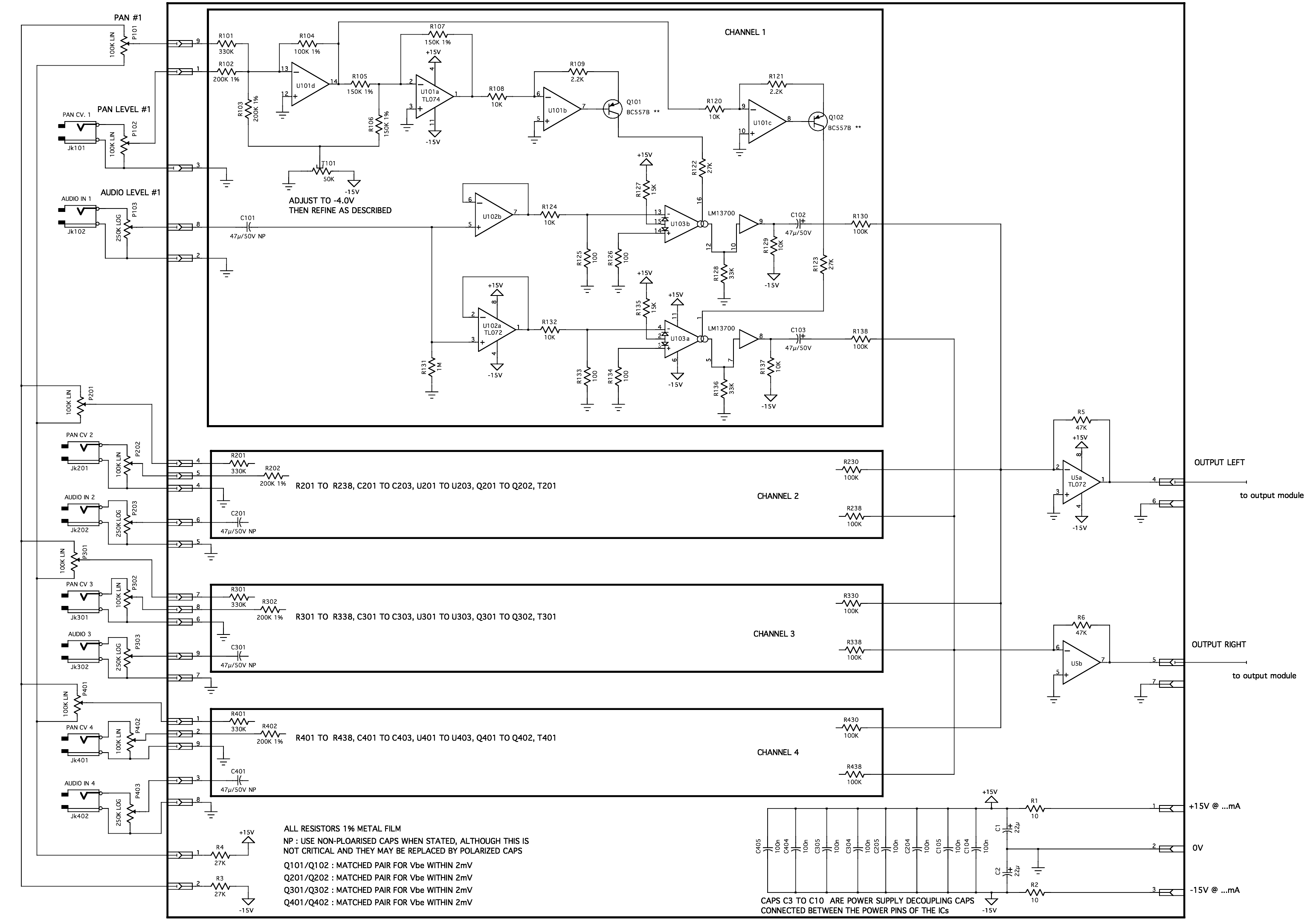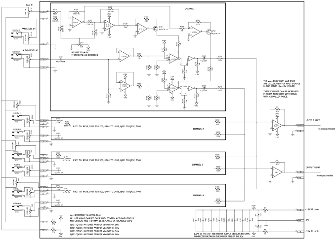 List of parts and building instructionsQUAD VC-PANNER & MIXERAll resistors are 1% (1/4W to 0.6W) unless specified otherwise Trannies are to be matched by pairs (Q101/Q102),(Q201/Q202)... Color black is used for components belonging to the common part of the circuit, colors red, blue, green, brown are used to discriminate the components as a function of the channel they belong. |