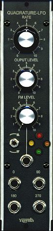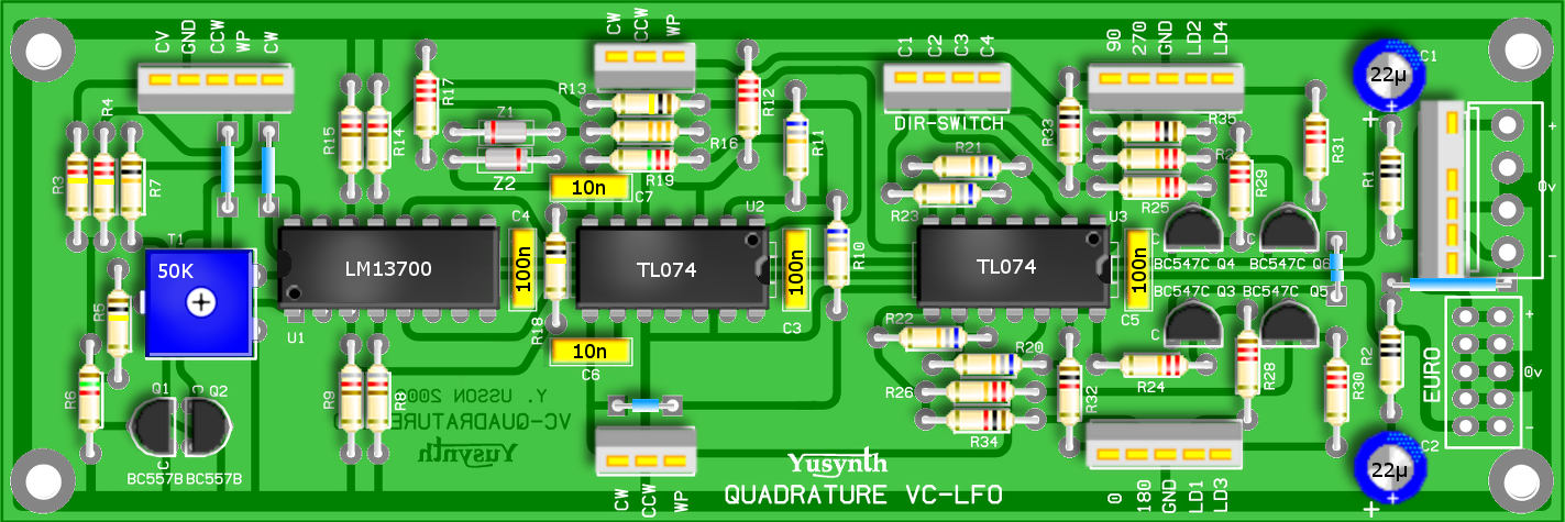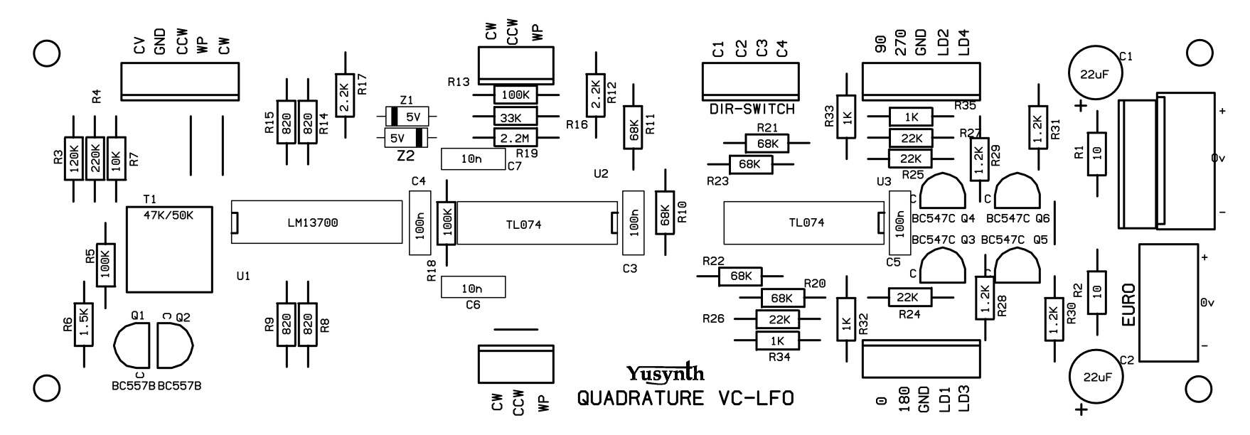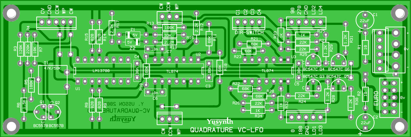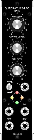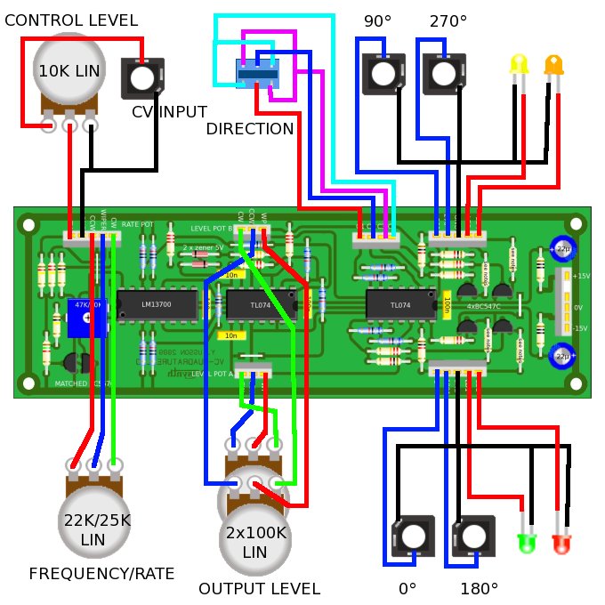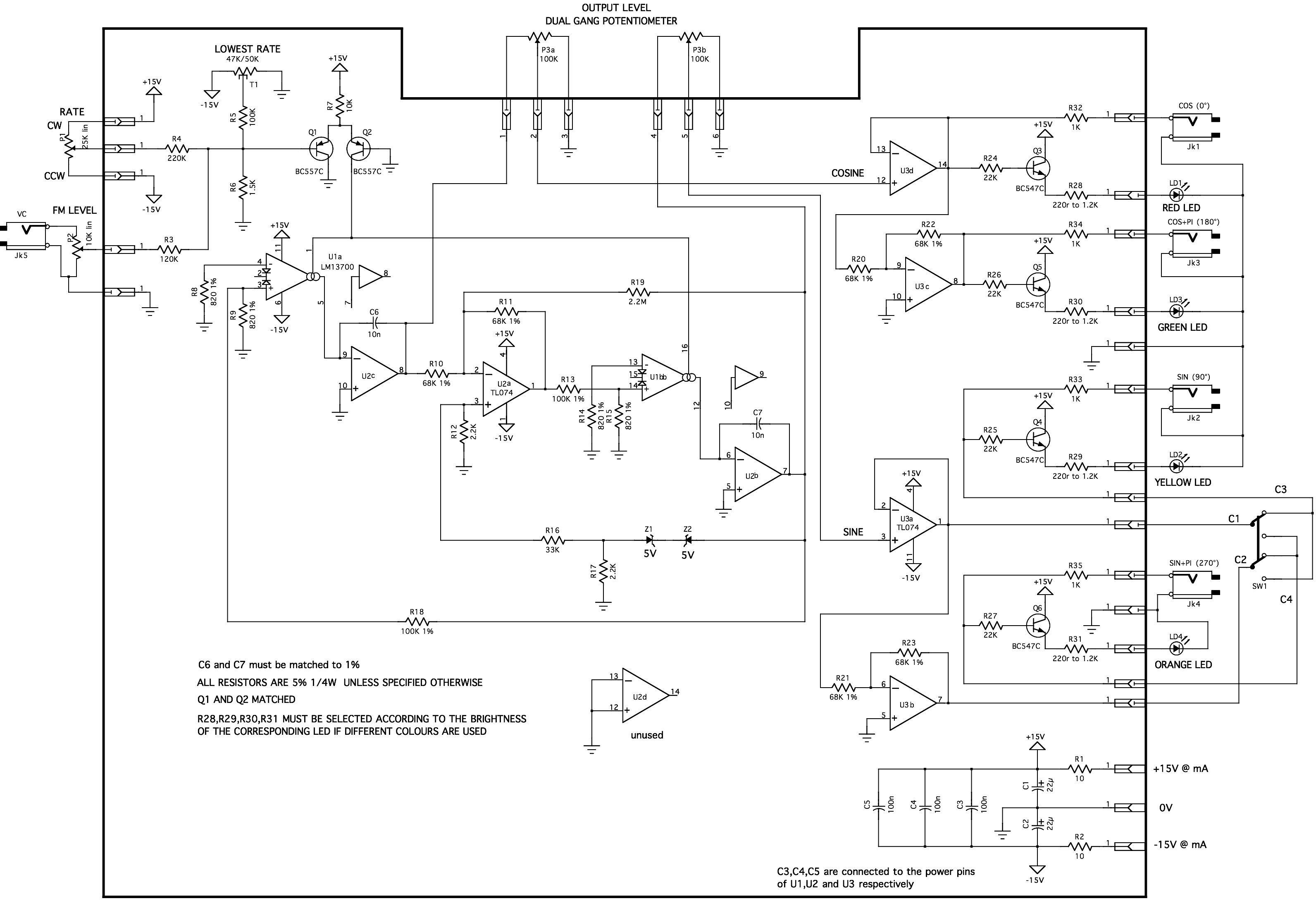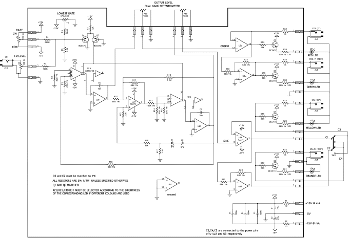 1ms/square, 1V/square) Set the RATE potentiometer to 10, the FM LEVEL pot to 0 and the OUTPUT LEVEL to 10. The module must work as soon as powered however at startup the amplitude of oscillation is quite low (0.1V) and it takes some oscillation cycles to reach the normal amplitude of oscillation (something like -8V/+8V), it reaches its maximum amplitude. When, it's oscillating at its steady amplitude, set the frequency pot to the minimal rate (fully counter clockwise) then adjust the trimmer T1 in order to set the lower rate (the lowest rate achievable is around 30s per cycle). Now set the rate to approximately 1s per cycle, the LEDs should lit in turn, for example RED, then YELLOW, then GREEN, then ORANGE or conversely. If this is not the case swap the connections of the LEDs. Toggle the switch, now the LEDs must lit in the opposite direction. |