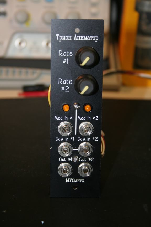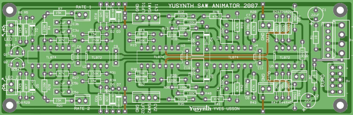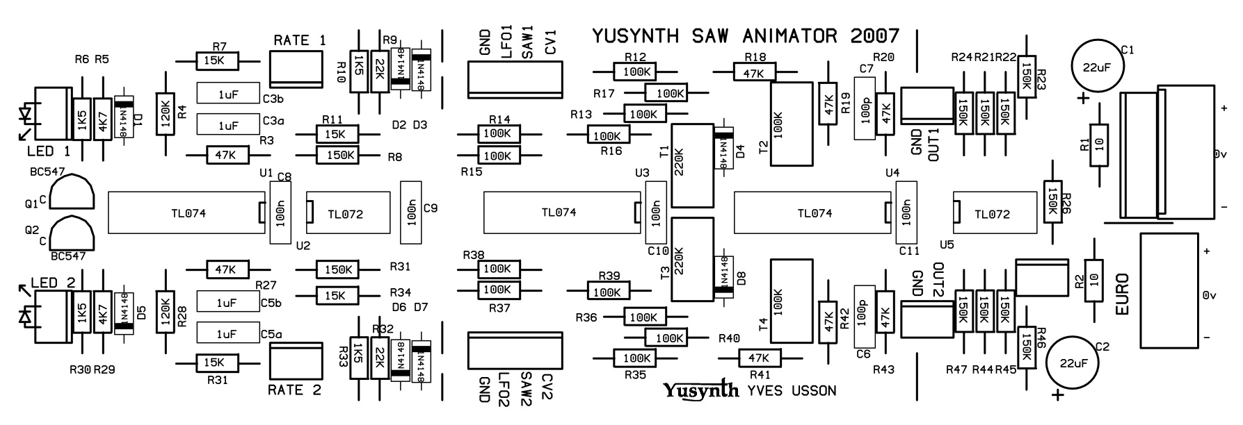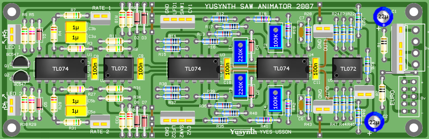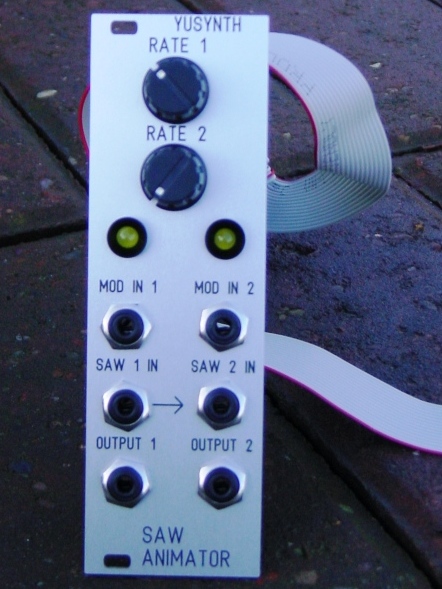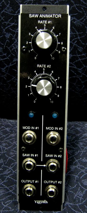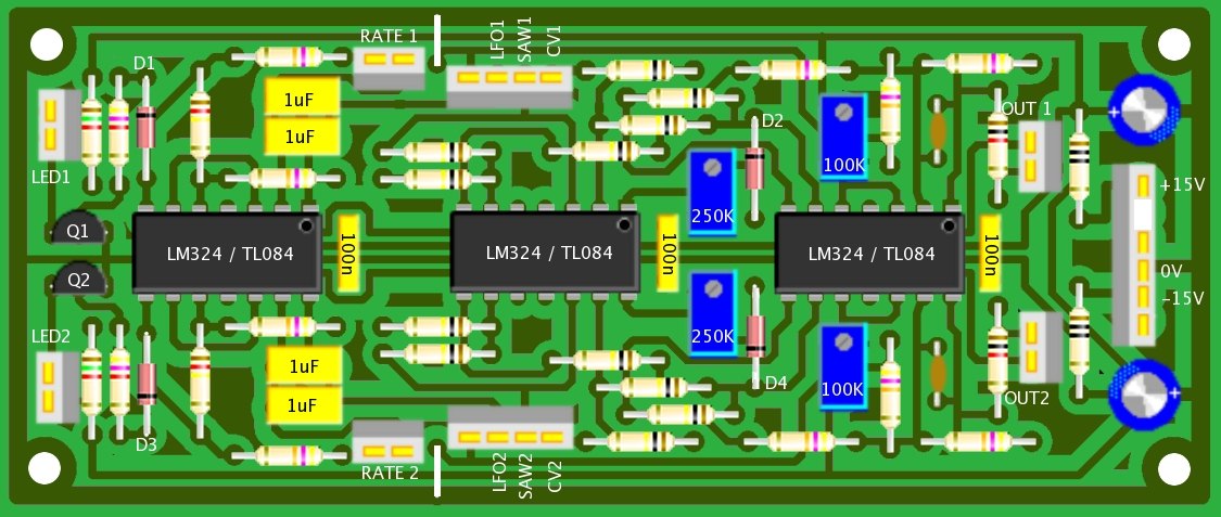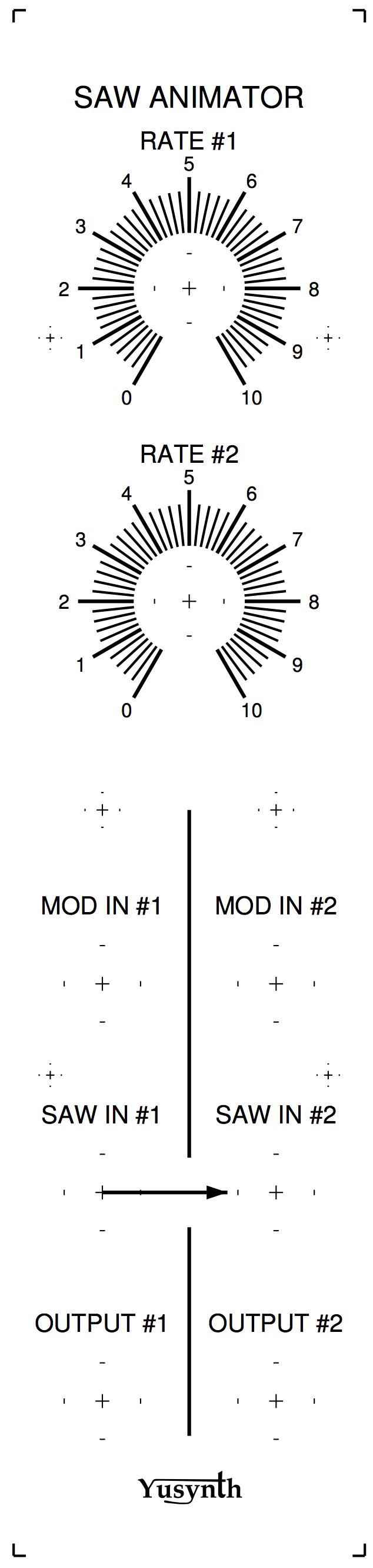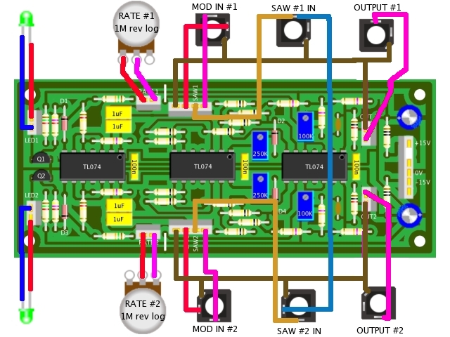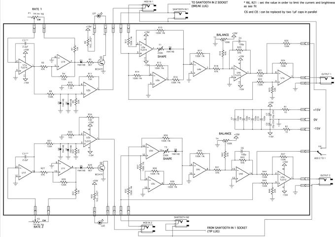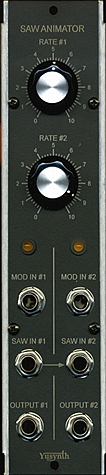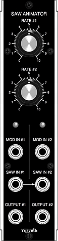 supprimez la mise à la masse de l'entrée MOD IN #1, vous devriez voir une DENT DE SCIE onduler au rythme du LFO interne Effectuer les mêmes réglages pour T3 et T4 en remplaçant les entrées et sorties par celles du second canal. |
