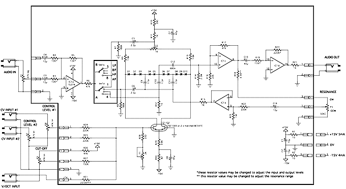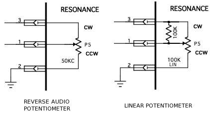 NOTE CONCERNANT P5 : Le modèle est du type REVERSE AUDIO (courbe C) mais comme ici il est utilisé en diviseur potentiométrique il peut être remplacé par un potentiomètre 100K linéaire avec une résistance de 100K connecté entre les broches MAX et CURSEUR du potentiomètre. (voir ci-dessous) ![]() |